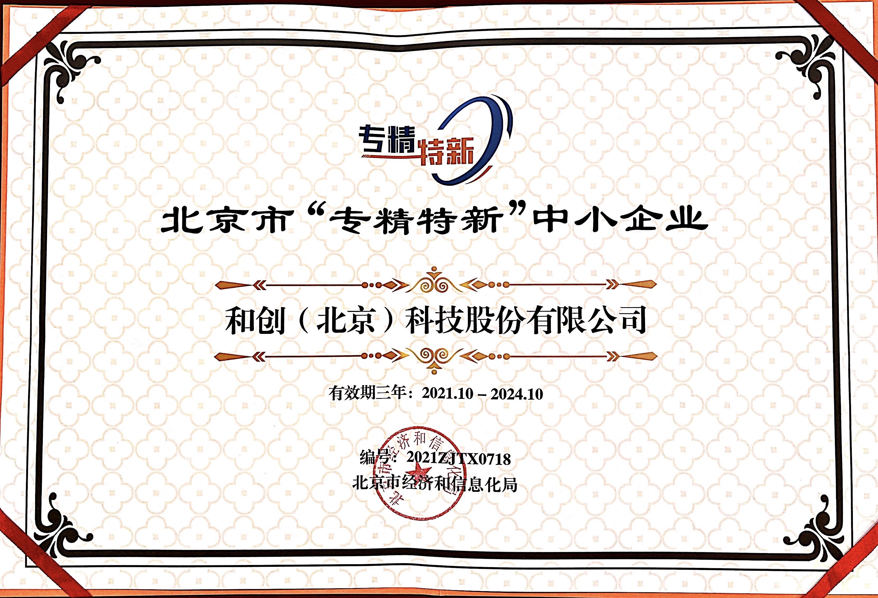 2021年10月29日,北京市經濟和信息化局將北京市2021年度第六批擬認定“專精特新”中小企業名單予以公示,和創(北京)科技股份有限公司(以下簡稱“公司”)榮登榜單,此次公示期為10月29日至11月4日,目前已通過公示期。