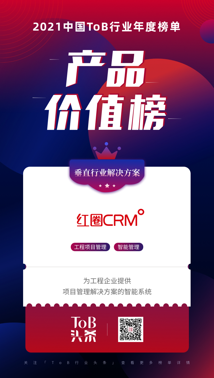 2022年1月4日,「ToB行業頭條」聯手3W集團正式發布了《2021ToB行業年度榜單·產品價值榜》,紅圈CRM工程項目管理系統榮登最具市場價值的ToB產品TOP30榜單!