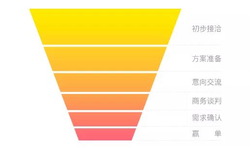 舉個(gè)例子,健康的銷售漏斗應(yīng)該是上圖這樣的,各階段的轉(zhuǎn)化率比較均勻,如果漏斗在中間某一段突然收窄,可能是在業(yè)務(wù)推進(jìn)的某個(gè)階段出現(xiàn)了瓶頸,這時(shí)企業(yè)需要結(jié)合產(chǎn)品的銷售周期等因素,尋找漏斗“阻塞”的原因,及時(shí)做出調(diào)整。
