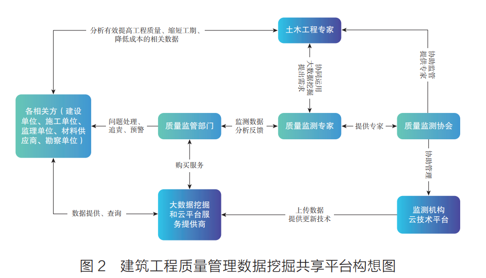 建立基于大數(shù)據(jù)挖掘的數(shù)據(jù)共享平臺,使質(zhì)量相關(guān)數(shù)據(jù)能夠在相關(guān)各方之間有效地傳輸與使用,進而提高企業(yè)工程質(zhì)量管理的水平及政府監(jiān)管效率。