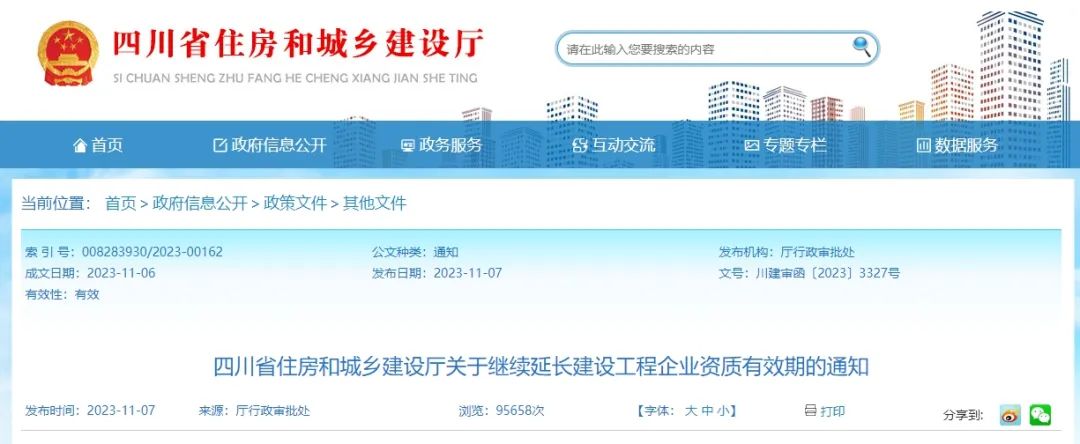 11月7日,四川省住房和城鄉(xiāng)建設(shè)廳發(fā)布關(guān)于繼續(xù)延長建設(shè)工程企業(yè)資質(zhì)有效期的通知。