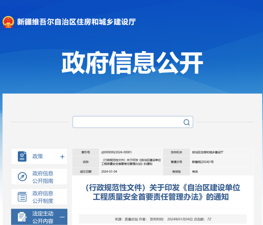 近日,新疆自治區住建廳印發《自治區建設單位工程質量安全首要責任管理辦法》的通知。自2024年2月15日起施行,有效期5年。