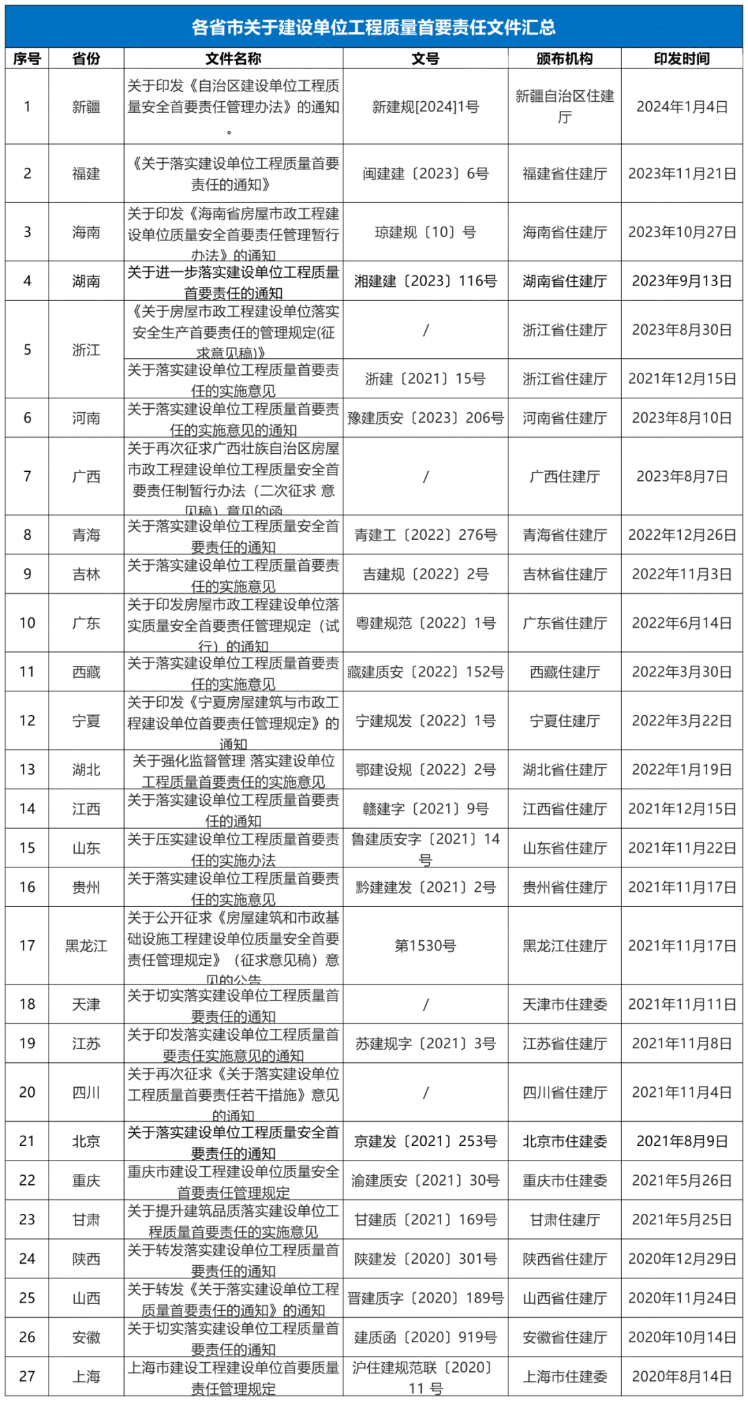 截至目前,27省市已經發文跟進住建部《關于落實建設單位工程質量首要責任的通知》(建質規〔2020〕9號),嚴格落實建設單位工程質量首要責任。