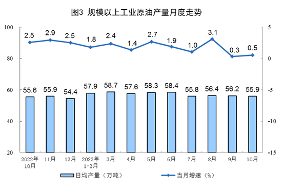 原油生產(chǎn)增速略有加快,進(jìn)口保持較快增長。10月份,生產(chǎn)原油1733萬噸,同比增長0.5%,增速比9月份加快0.2個百分點(diǎn),日均產(chǎn)量55.9萬噸。進(jìn)口原油4897萬噸,同比增長13.5%,增速比9月份放緩0.2個百分點(diǎn)。