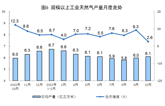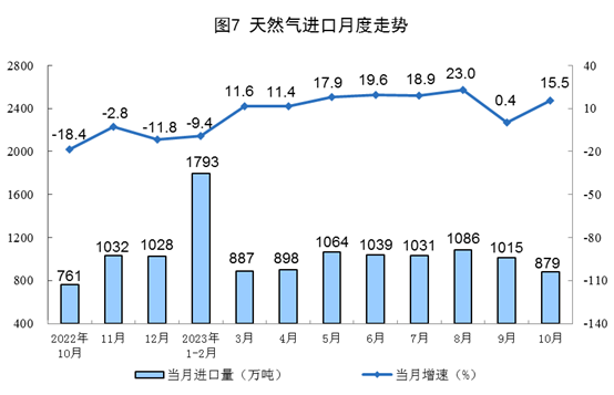 天然氣生產(chǎn)保持平穩(wěn),進(jìn)口增速加快。10月份,生產(chǎn)天然氣190億立方米,同比增長2.6%,增速比9月份回落6.7個百分點(diǎn),日均產(chǎn)量6.1億立方米。進(jìn)口天然氣879萬噸,同比增長15.5%,增速比9月份加快15.1個百分點(diǎn)。