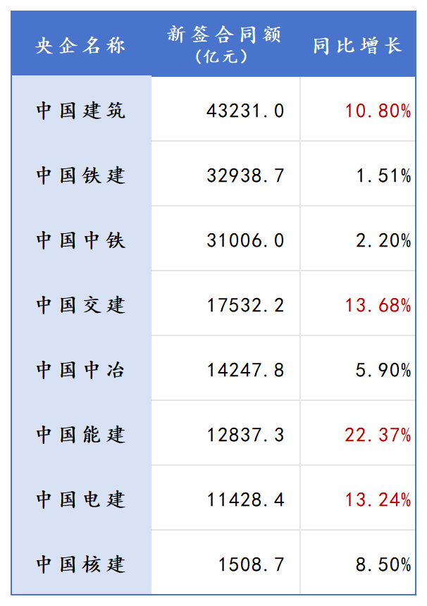 此前,八大建筑央企已公布2023年新簽合同額情況,具體如下: