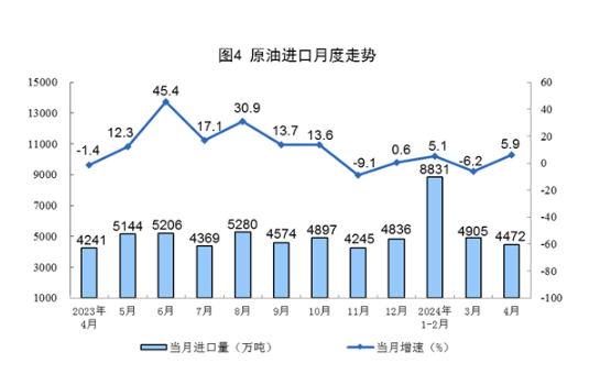 1—4月份,規上工業原油產量7095萬噸,同比增長2.1%。進口原油18207萬噸,同比增長2.0%。