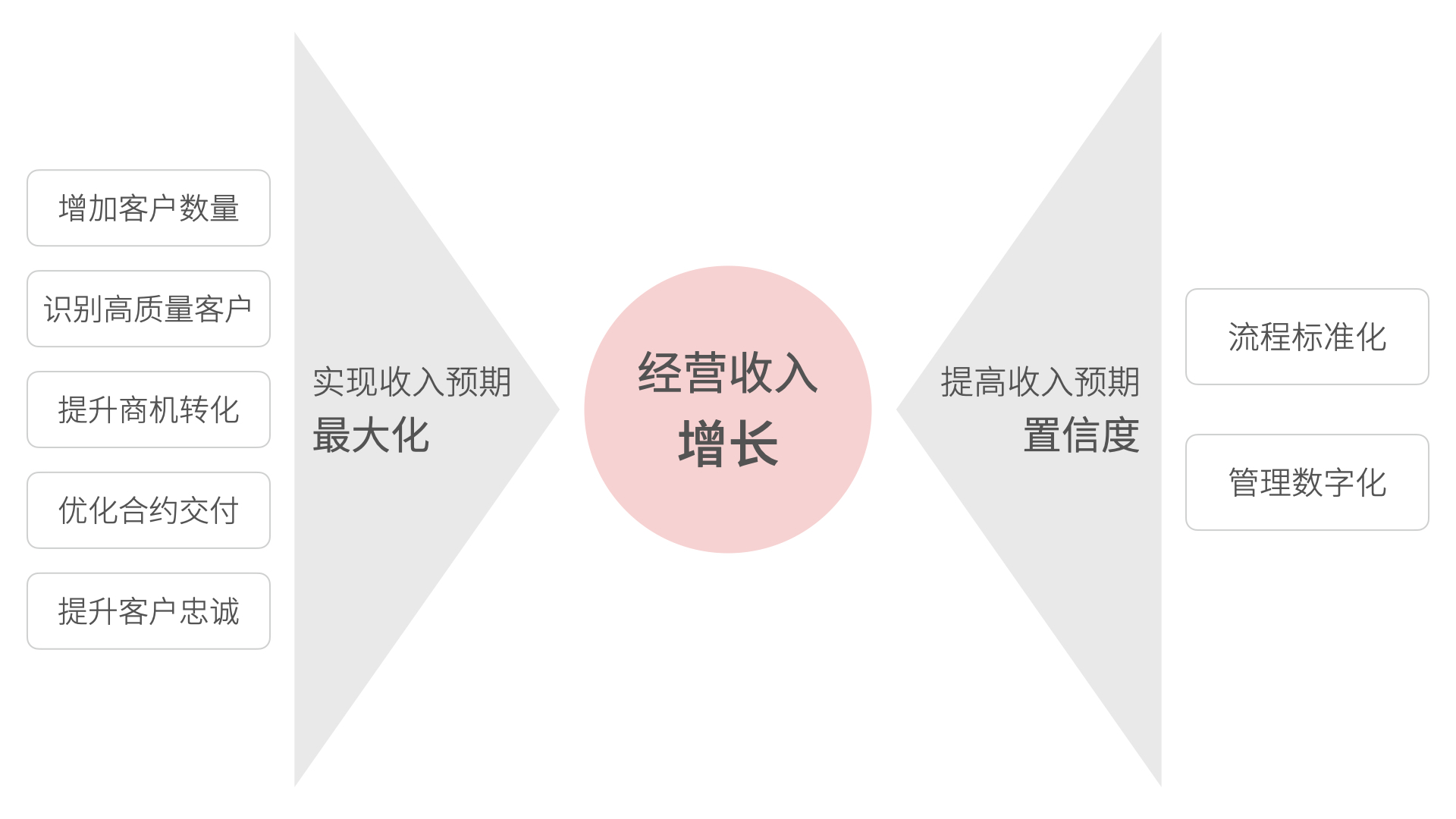 為了實現企業經營收入增長這個核心目標,CRM 軟件需要企業實現收入預期最大化和提高收入預期置信度。實現收入預期最大化這個目標可以從五個方面入手:增加客戶數量、識別高質量客戶、提升商機轉化、優化合約交付、提升客戶忠誠。而提高收入預期置信度的本質是降低業務戰略執行的不確定因素,從人治模式轉型為系統管理,即流程標準化和管理數字化。